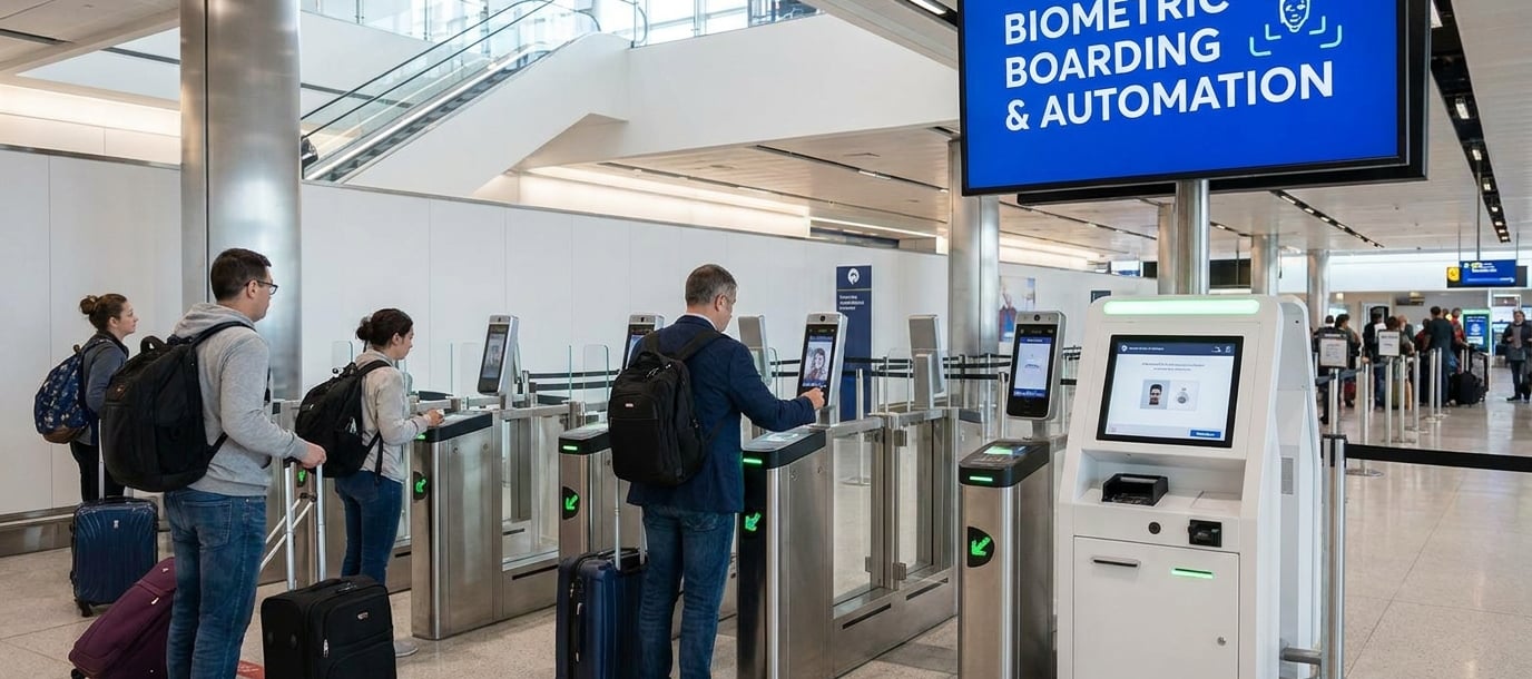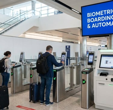 Безконтактни иновации: Лицевото разпознаване и сканирането на отпечатъци стават стандарт на летищата за по-бърза проверка и качване на борда (contactless boarding).